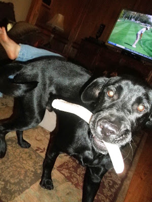 Smokey frequently plops his toys up in the chair with me to summon me to play. Or, maybe in this case, he's just hinting around for a gnawhide ring refill for his Busy Buddy Bone?